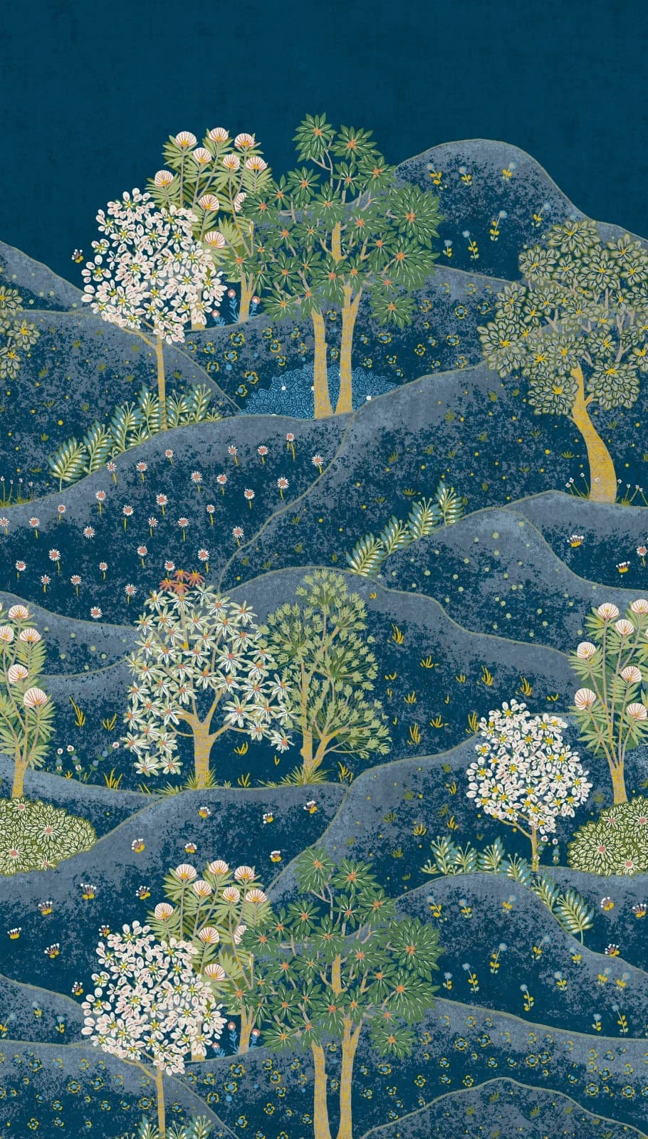 Digitaldruck Hügel Bäume Blumen Blau Grün Weiß ML1802